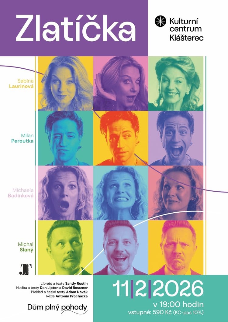 ZLATÍČKA – muzikálová komedie plná emocí a humoru 11. února 2026 | 19:00 Kulturní centrum Klášterec – Velký sál ️ Vstupné: 590 Kč (držitelé KC-pasu sleva 10 %)