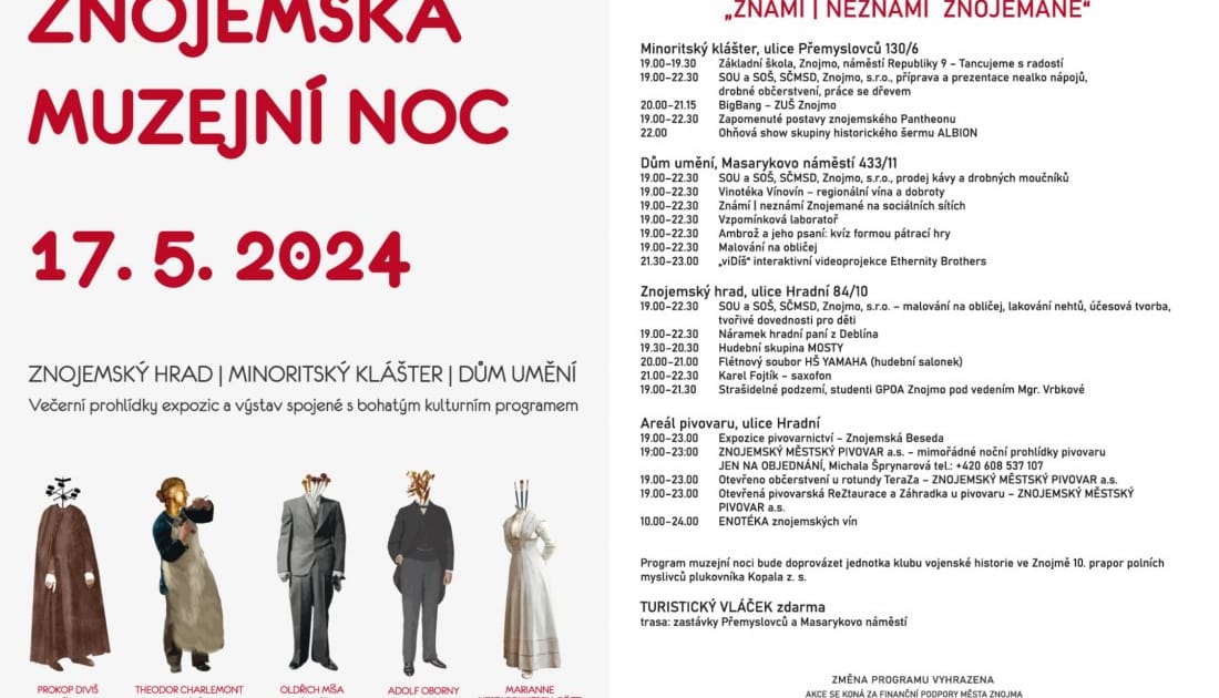 Od 19 do 23 hodin bude volný vstup do muzejních expozic v Minoritském klášteře, v Domě umění, na Znojemský hrad i do Expozice pivovarnictví. Po předchozí rezervaci budou možné také mimořádné noční prohlídky Znojemského městského pivovaru. Po celý večer bude jednotlivé budovy v centru města propojovat Znojemský turistický vláček, který bude jezdit zdarma ze zastávek v ulici Přemyslovců a z Masarykova náměstí.